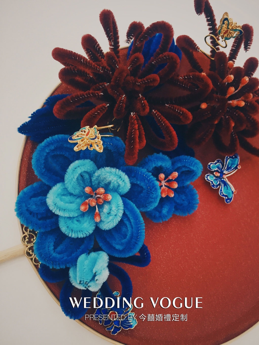 《锦上添花》的手捧为“团扇”。其中特别之处手工制作的仿绒花。随着《延禧攻略》的热播,非遗手工艺“绒花”得到了重视。因此这款手捧就在团扇上点缀了绒花装饰。因为不是按照非文化遗产的严谨做法来操作,因此今囍将其称为“仿绒花”。