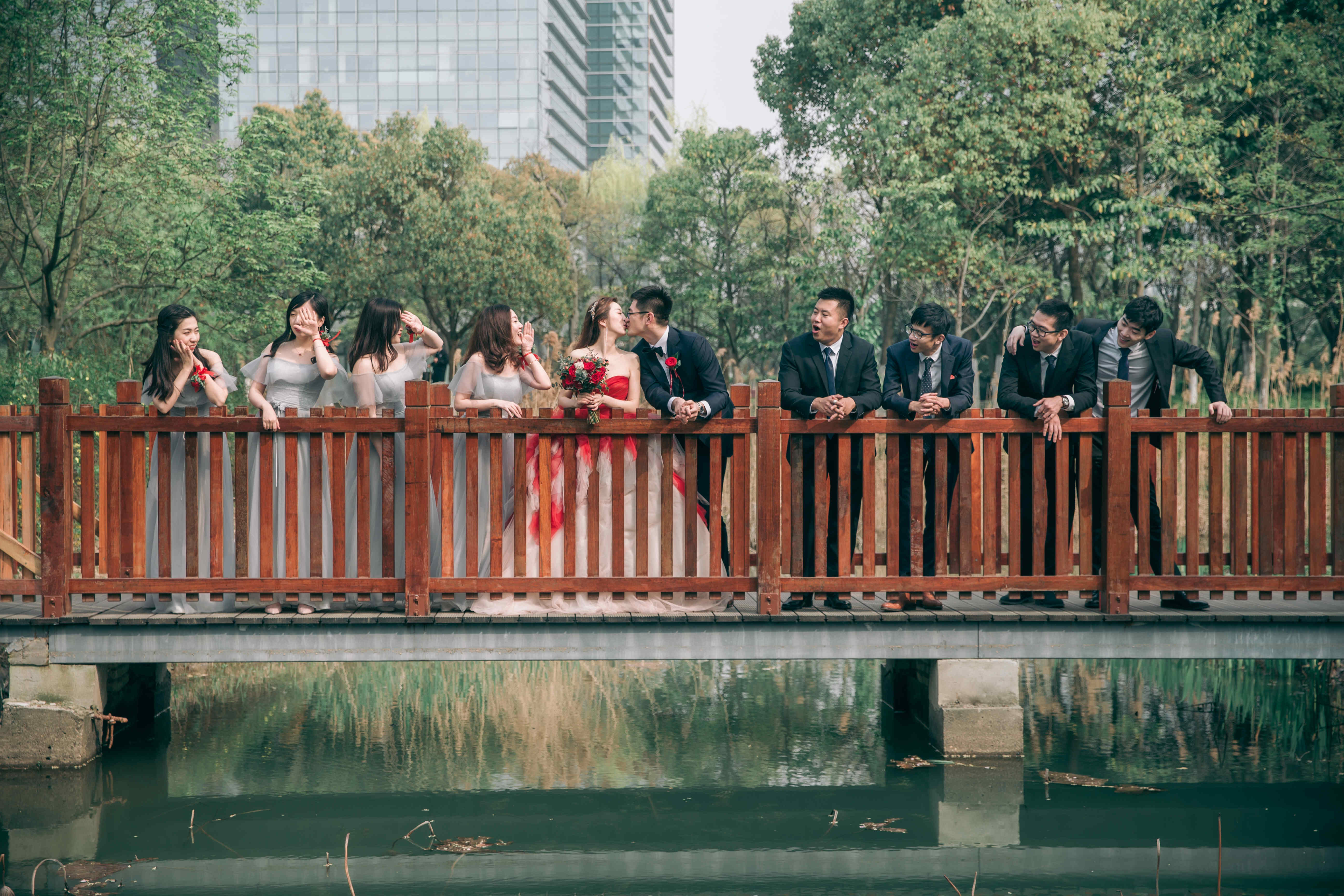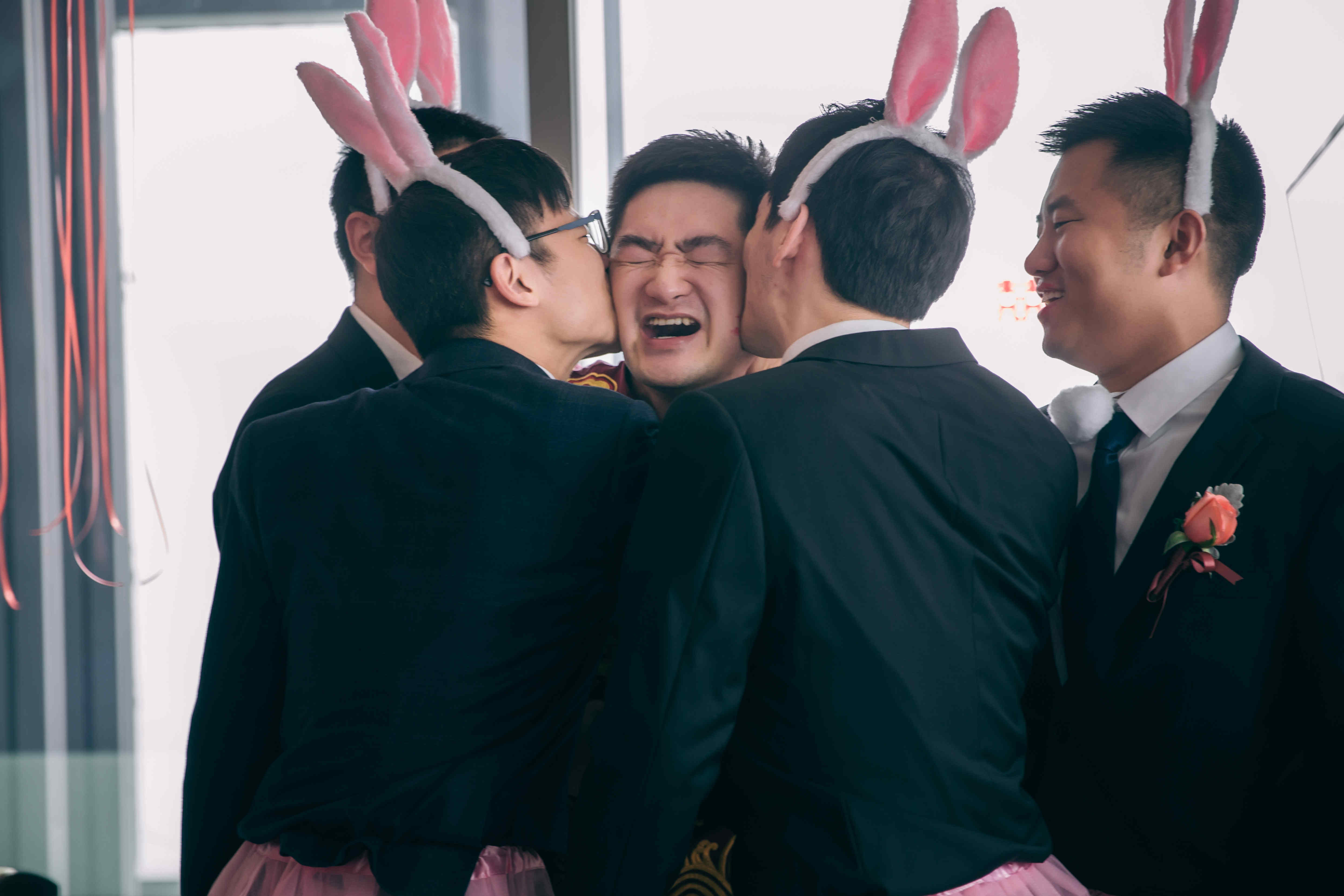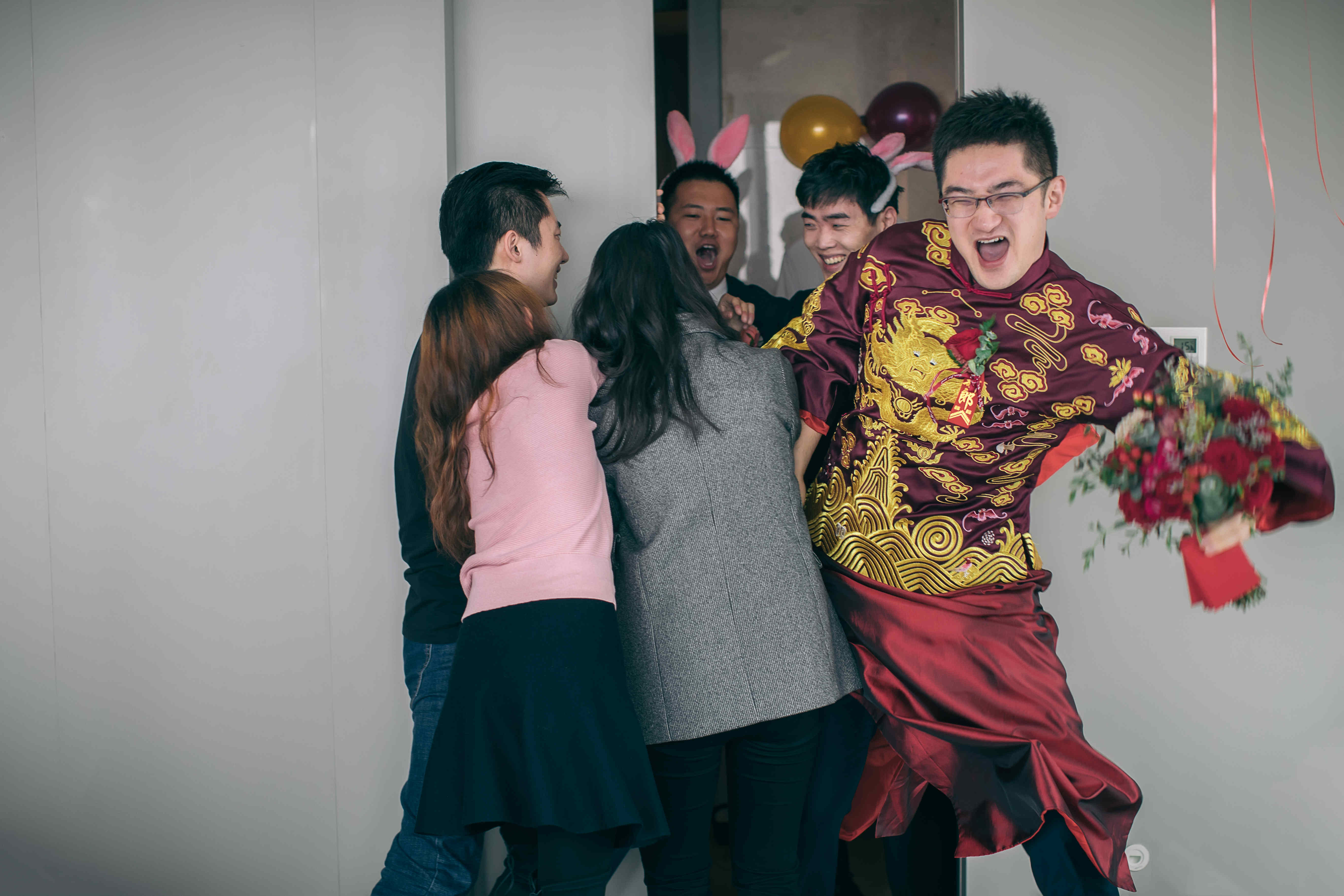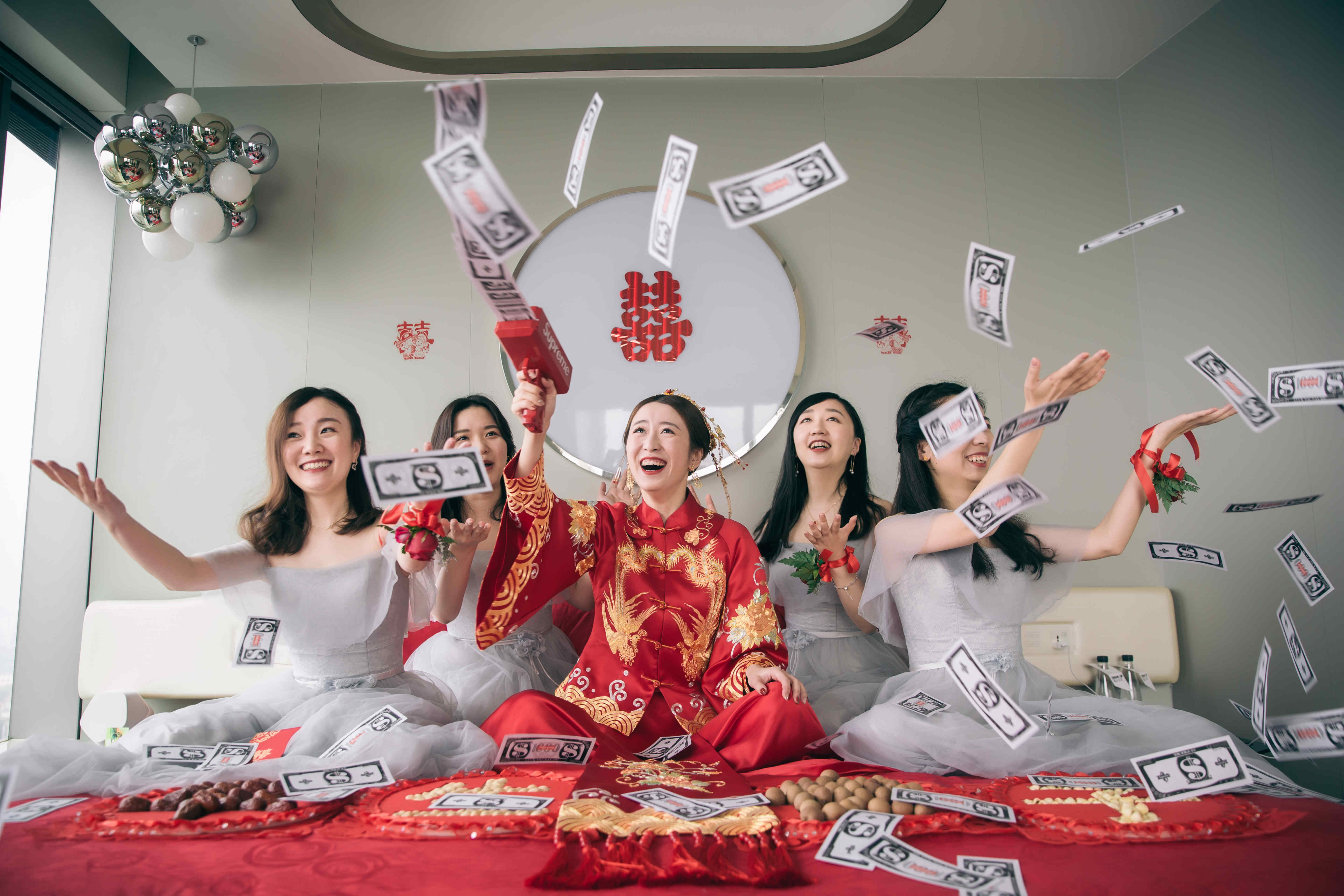 新郎幽默搞怪,新娘温和安静,性格如此互补的一双人,叫人好不羡慕!今天是他们大喜的日子,伴娘们早早做好防守工作,准备好好为难下新郎,不等伴娘反应,新郎带着六个伴郎冲了进来,不像接亲更像“抢亲”呢,看来新郎真的是迫不及待的想把我们美丽的新娘娶回家!