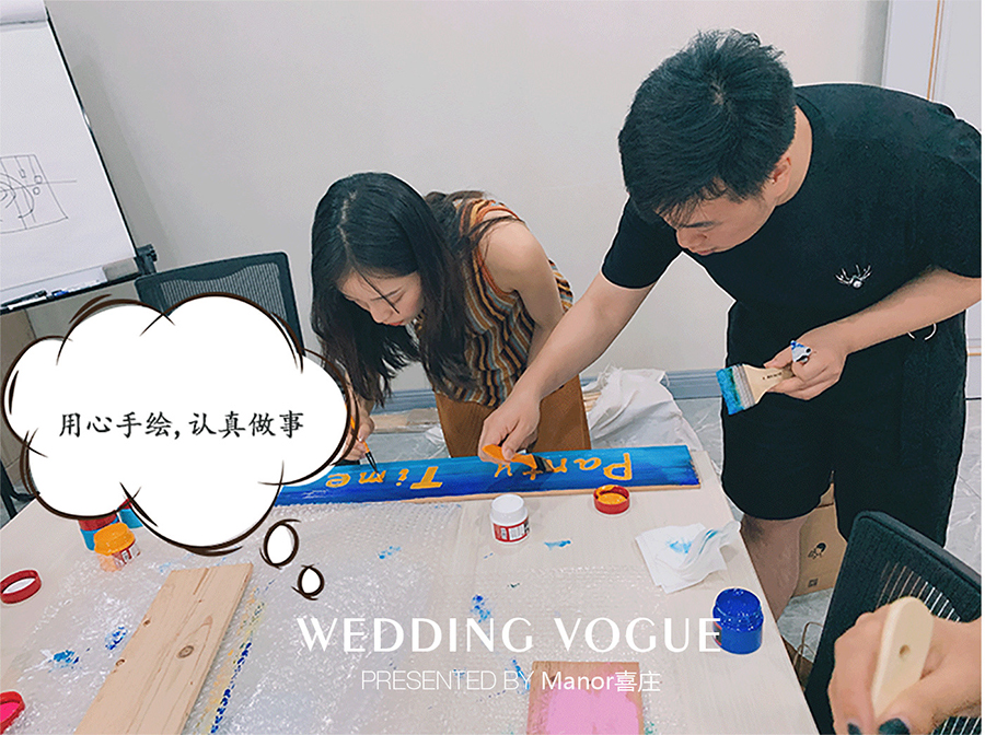 这场婚礼仅仅只有十几天的筹备时间,从出方案到落地执行,过程很紧张,建立的工作群每天几乎都响到凌晨十二点,加班制作似乎成了喜庄婚礼习以为常的事情。小伙伴们在忙碌中期待着,在紧张中又憧憬着。
