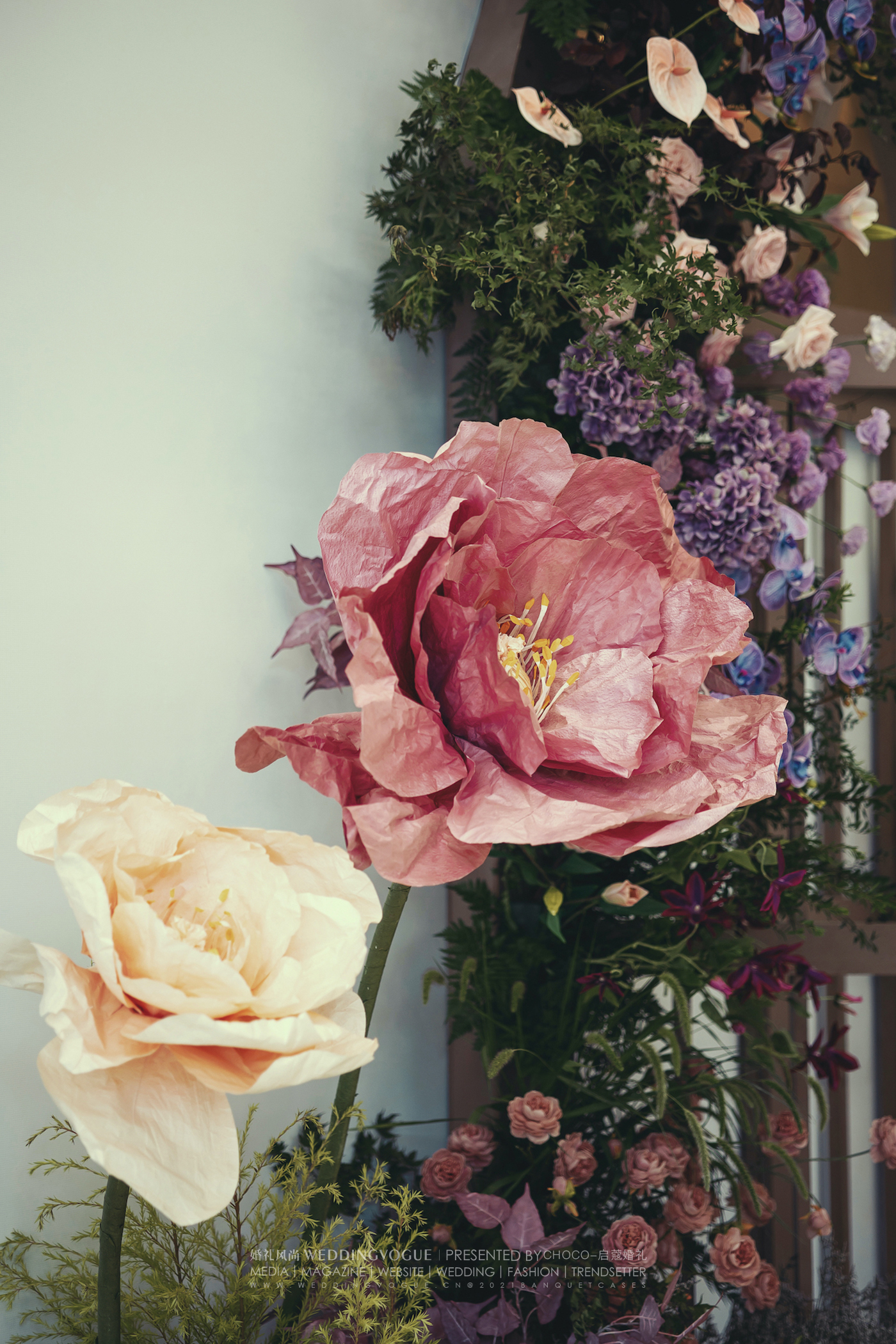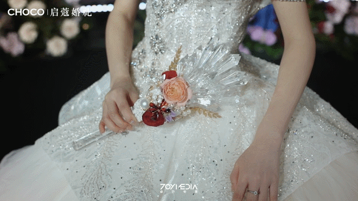 手工花的运用也是整场的点睛之笔,夸张的大手工花像油画中的静物画。