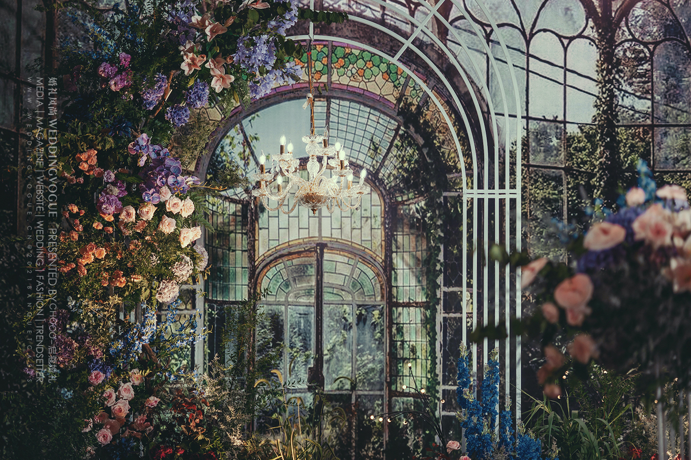 风格是复古的油画花园风,用丰富的平面背景画面和立体的花艺结合,打造出深邃如置身画中的花园景色。