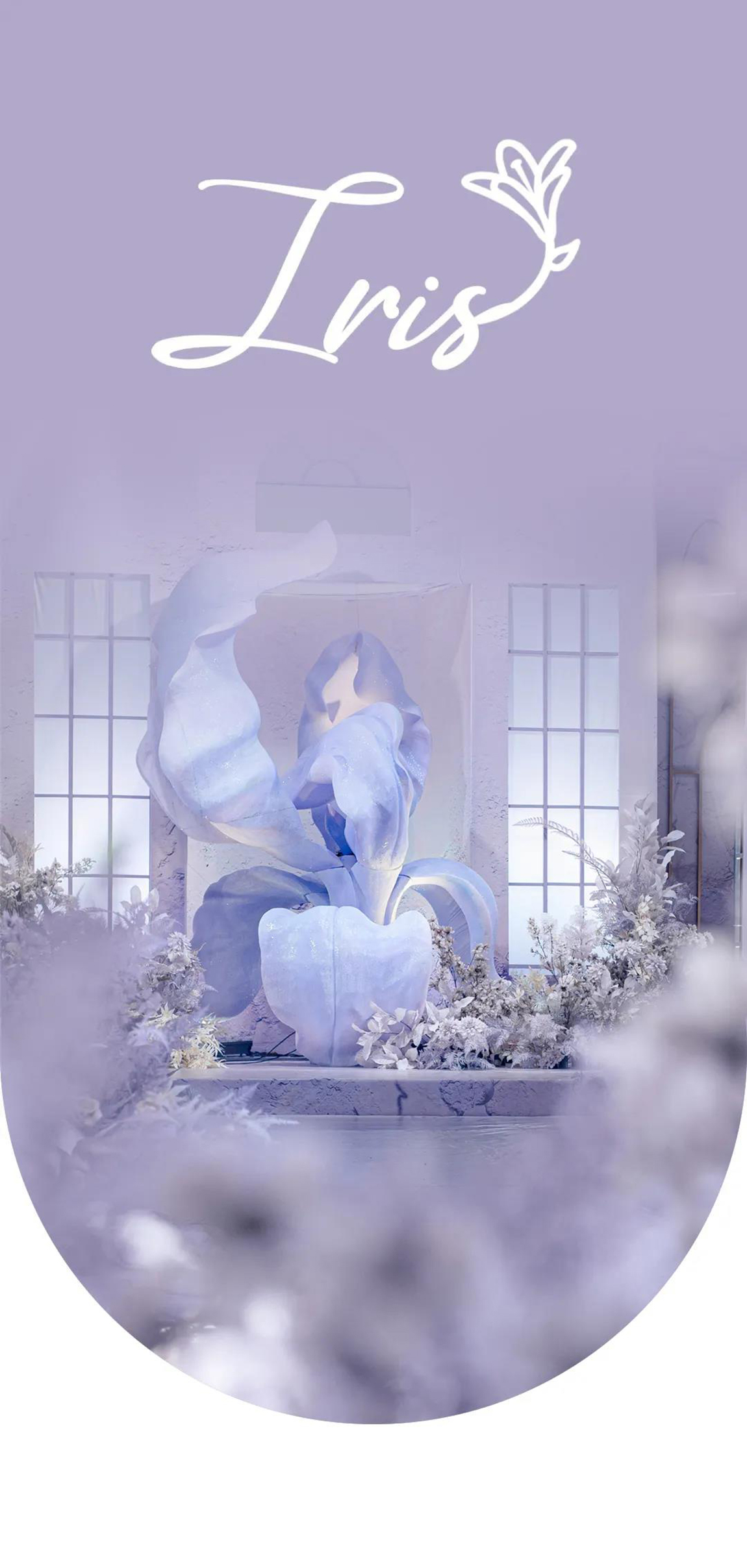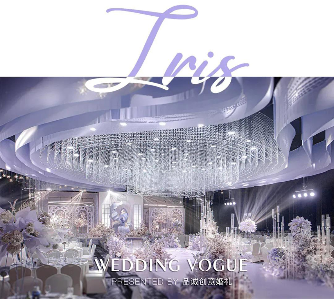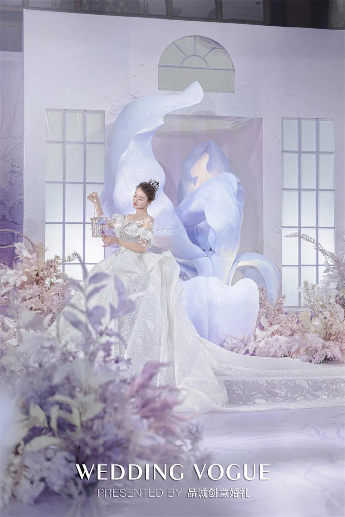 主舞台品诚创意婚礼设计了一个绽放的鸢尾花。鸢尾花象征思念,白色是纯真且明媚,蓝紫色是高雅与爱情,一如婚礼的初衷