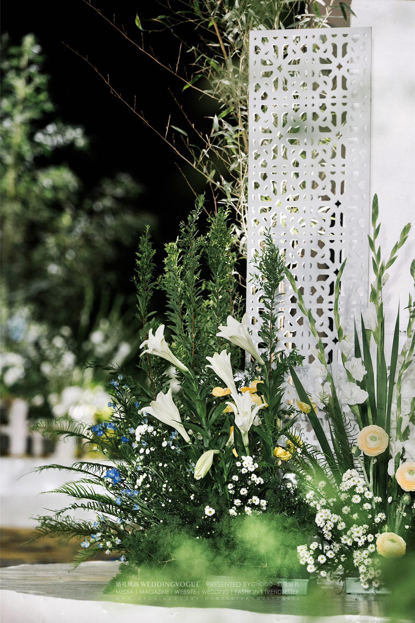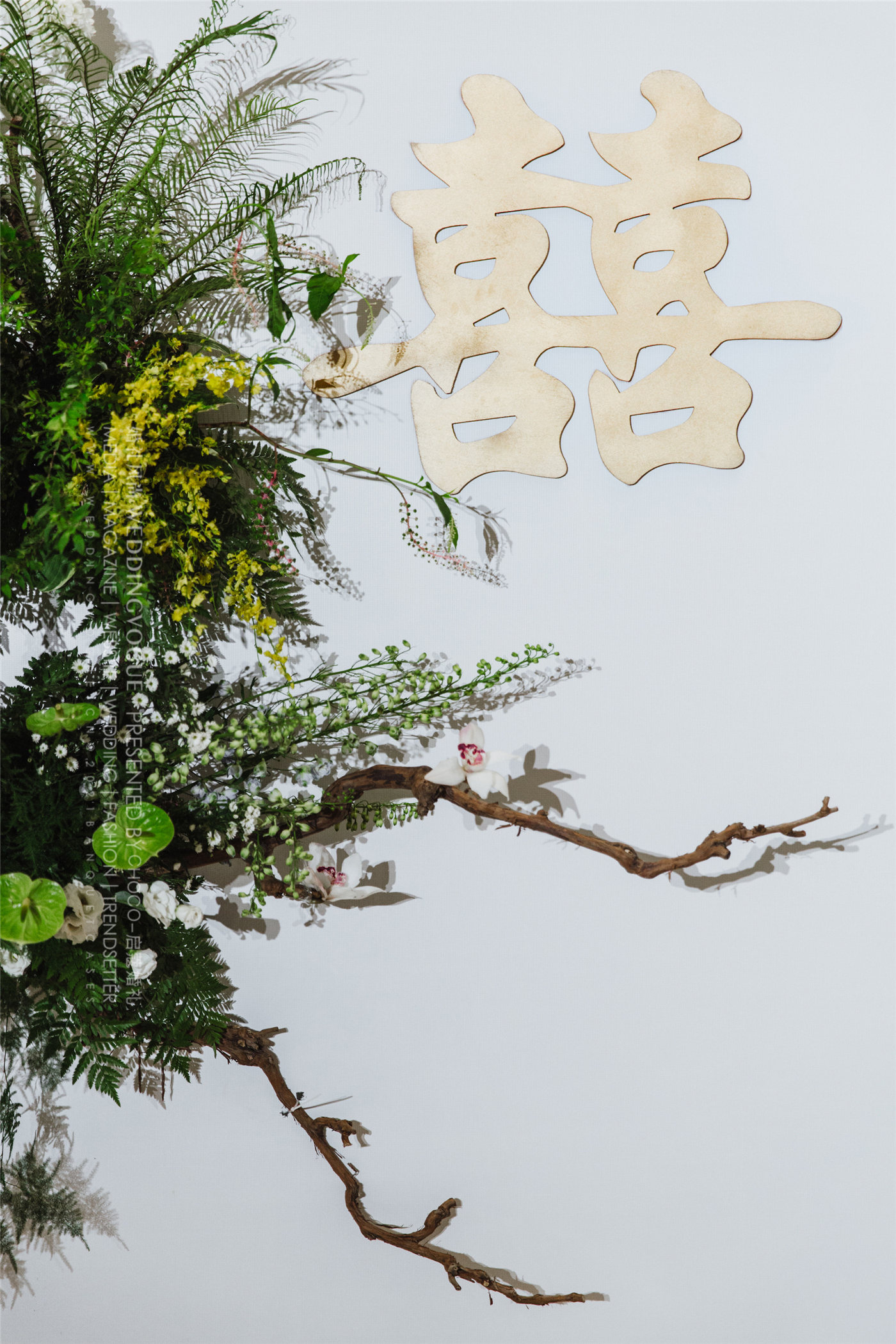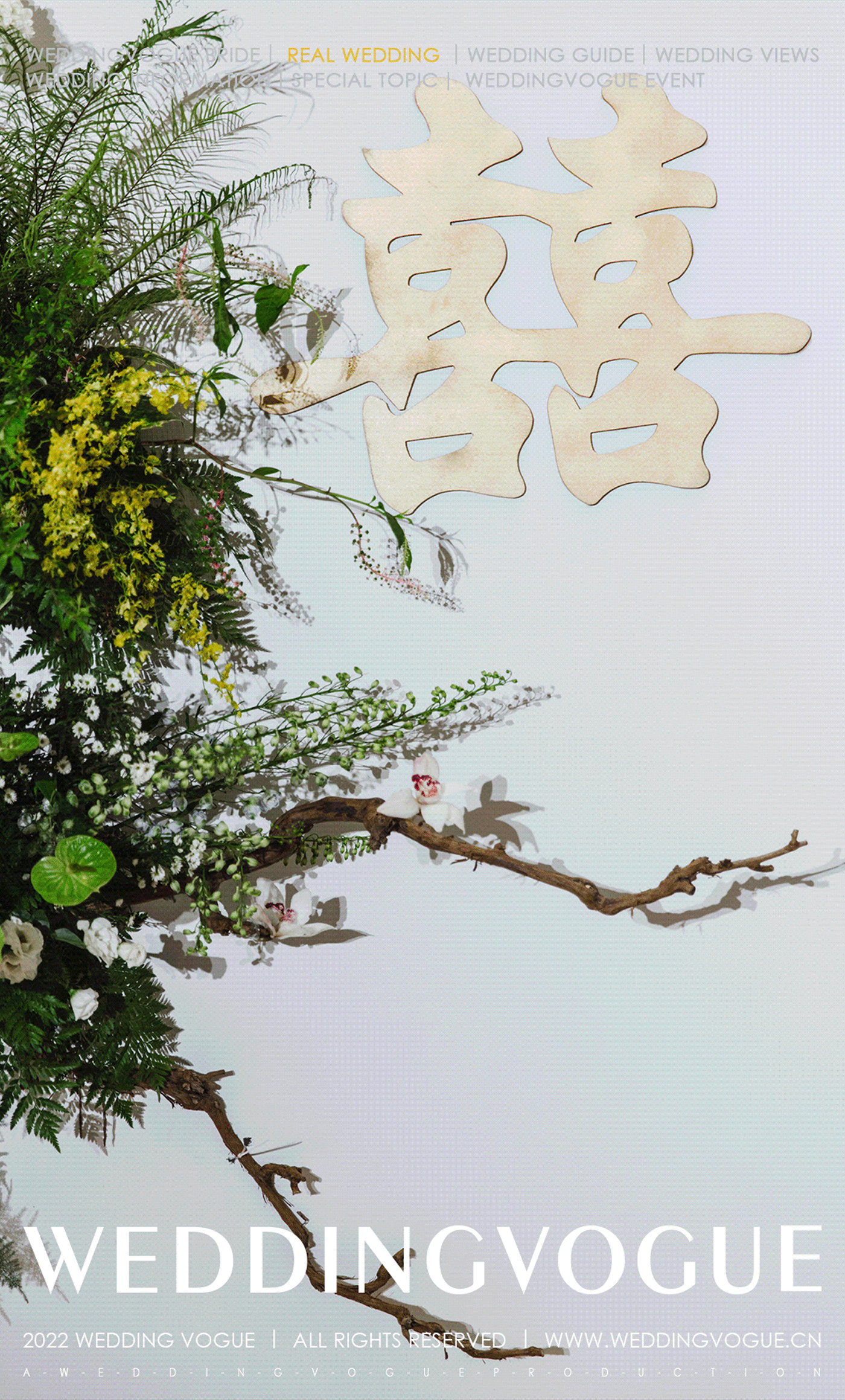 枝丫的枯黄和花簇的鲜绿形成色彩对比,又长短不一,中式造景手法之下的留白,呼应了中国文化中特有的意境之美,留给新人和宾客更多的想象空间。