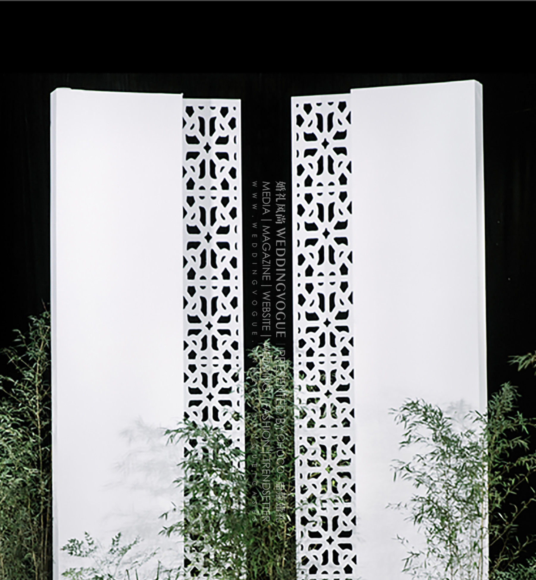 在仪式舞台上,两块纯白的立面矗立在翠竹之中,犹如山林中宏伟的建筑,立面的边沿以镂空的窗棂纹作为装饰,绿色的竹叶、曳动的光影和大片的留白,共同构建出园林的沉浸式体验和空间意境美感。